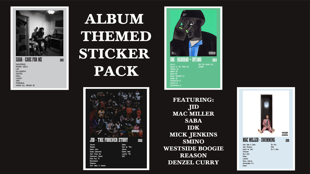 Rep your favorite modern hip-hop and rap albums with this diverse sticker pack! Featuring iconic artwork and imagery from JID, REASON, Saba, Smino, Westside Boogie, Denzel Curry, Mac Miller, Mick Jenkins, and IDK, these stickers are perfect for customizing your space.